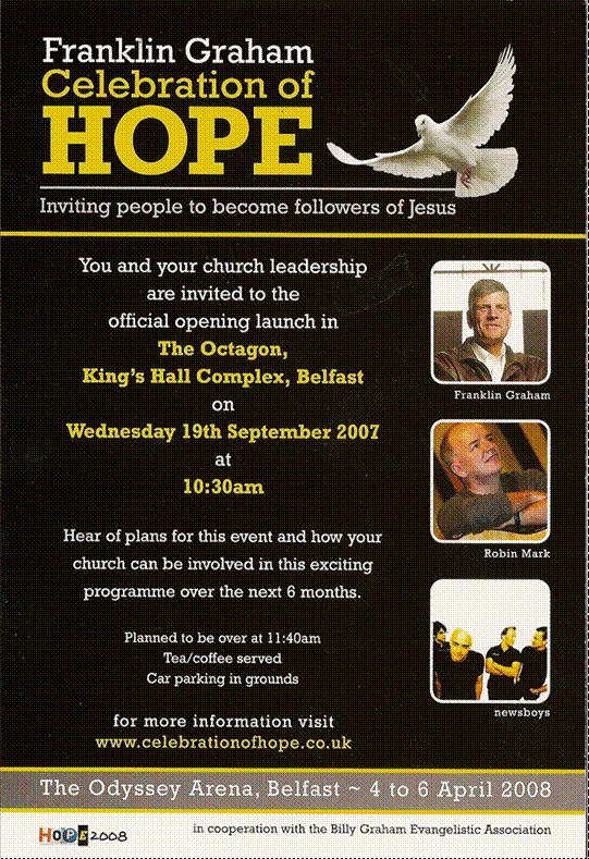 Perhaps it was felt that local evangelicals might not be too keen to support an initiative, Celebration of Hope, that had an ‘official association’ with a national initiative [HOPE 2008], that for its part had ecumenical support at the highest ecclesiastical level [Rowan Williams, Archbishop of Canterbury and Cardinal Cormac Murphy O’Connor], that had active support/involvement from the General Director of Evangelical Alliance [Joel Edwards] and that was being ‘fronted’ locally for promotional purposes by the Northern Ireland Director of Evangelical Alliance, Stephen Cave. ‘Is there /was there’ an ‘official association’ between Celebration of Hope and HOPE 2008? – the official ‘party line’ on the website of Celebration of Hope says that ‘there is no official association between the two organizations’. In the light of what I have shared in this article perhaps the issue is not just as ‘clear-cut’ as that denial claims. We should never forget the previous ‘shady’ dealings that took place between CARE [NI] and Evangelical Alliance [NI] as they sought to involve so-called ‘Evangelical Catholics’ in their ‘evangelistic’ ‘Passion Movie Café’ outreach in Central Belfast. In the article that I wrote about that sorry episode http://www.takeheed.net/CAREEAAGENDAS.htm I wrote [and still stand over] – “Information that is now in my possession shows that there was no ‘naïveté’ on the part of Hugh Marcus [of CARE] but rather this was a calculated strategy and ‘agenda’ on the part of both Hugh Marcus and Stephen Cave [of Evangelical Alliance] and their aim was to keep their hopes for ‘Evangelical Catholic’ involvement hidden from the public” In closing, let me just point out that sadly, where Franklin Graham is concerned, he is adopting the same ecumenical view of the Papacy that his father held as this website posting clearly shows –